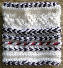 The first class I did was on Thursday and was Baltic Braids and Bobbles with Nancy Bush. We knitted the sampler below which included a special braid cast on, several different braids and some nupps. I worked out a 2-colour cast off with one of the braids to finish the sample. Most of the braids where taken from Estonian knitting but one was from Latvia.